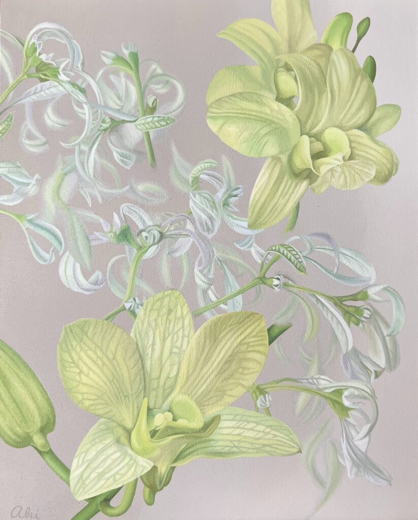同じ色味(黄緑色)でもブルーベースのユーフォルビアとイエローベースの蘭ではしっかりと違いが出る様、繊細な色彩表現をテーマに描きました。